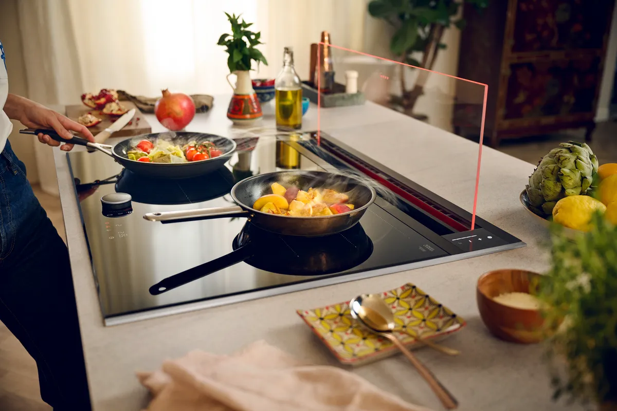 Ausfahrbarer Tischlüfter oder integrierter Kochfeldabzug: Beide Systeme erfassen Kochdunst direkt am Entstehungsort. Der Tischlüfter ist hinter dem Kochfeld positioniert und fährt bei Bedarf elektrisch aus, während das integrierte Modell als kompakte Einheit mit zentraler Absaugung im Kochfeld überzeugt.