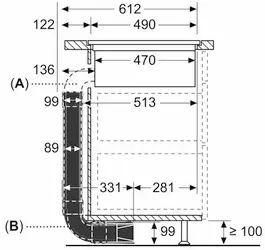 Die Vorzugsverrohrung für die teilgeführte Umluft nur in Kombination mit Kochfeld-Sets inkl. 1. Flachkanalbogen verwenden.