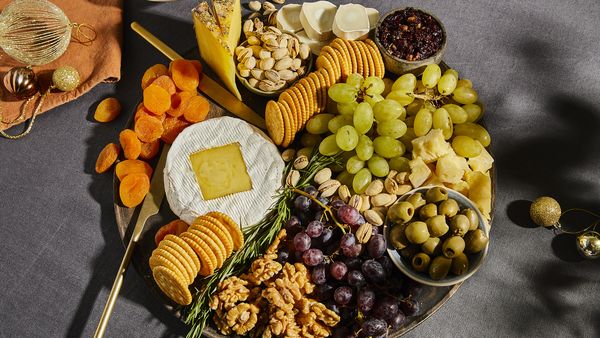 Serveer de kaas en druiven op een groot (houten) bord of schaal. Vul vervolgens de openingen op met de kleinere bijgerechten die je hebt gekozen voor je charcuteriebord. Denk aan verschillende hoogtes, kleuren en texturen om een samenhangende presentatie te creëren. Geniet!