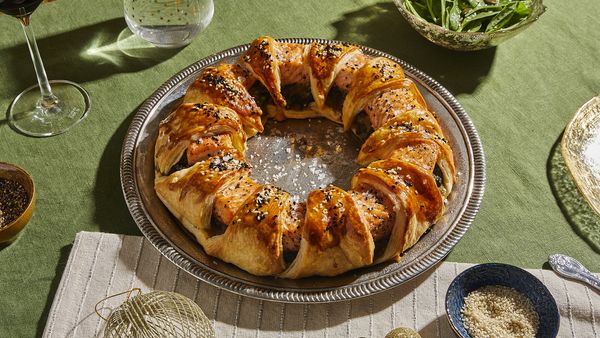 Bekleed een springvorm (26 cm diameter) met bakpapier. Plaats de eerste driehoek op de springvorm, zodat de lange punt naar buiten wijst en de korte zijde de rand met ongeveer 2-3 cm overlapt. Plaats de volgende driehoek op dezelfde manier, zodat deze ook de eerste driehoek overlapt. Ga zo door totdat alle driehoeken op de springvorm liggen. Verspreid het spinazie-paddenstoelmengsel over het bladerdeeg in een cirkel. Leg de zalmblokjes op het mengsel en begin de lange punten van buiten naar binnen te vouwen, zodat ze over de vulling komen te liggen. Druk de punt een beetje onder het bladerdeeg voor betere stabiliteit. Ga op deze manier door met alle driehoeken totdat je een gevulde krans hebt.