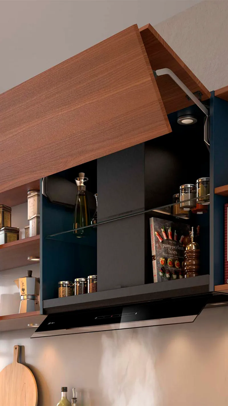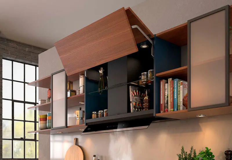 Integrated design hoods: lots of space to hideOur Integrated Design Hood masters disappearance, seamlessly concealed within your cupboard. Its sleek glass panel unfolds, auto-activating light and powerful extraction. Maximise your kitchen's potential with clever hidden extra storage space (up to 10kg!) and tailored integration for modern cabinetry. Enjoy a durable, easy-clean finish and warm LED lighting for an inspiring, uncluttered masterpiece.Discover more